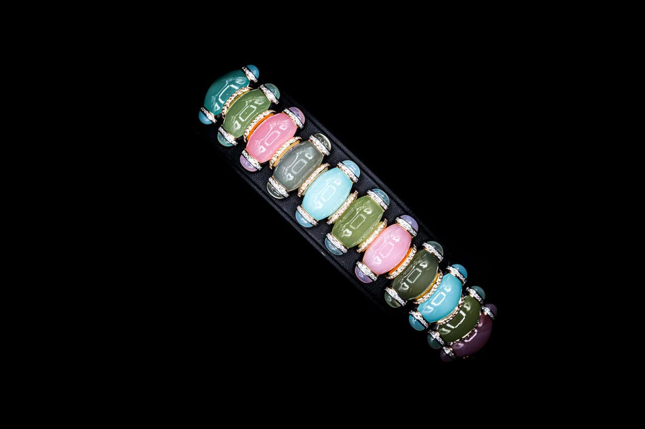 This bracelet is adorned with 11 pastel-coloured chalcedonies with a total of 249.87ct, elegantly strung together. Diamonds of 3.26ct complete this jewel with a brilliant shimmer. The memorable bracelet is set in 18kt white and rose gold.