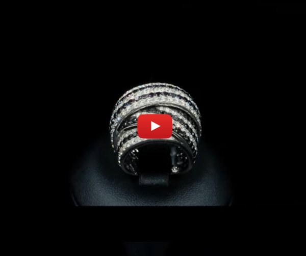 113 Brillanten mit insgesamt 2.70ct in schwarz und weiß wurden in der Fassung des Ringes eingelassen. Die geschwungene Form verleiht dem schlichten Design eine einzigartige Erscheinung.