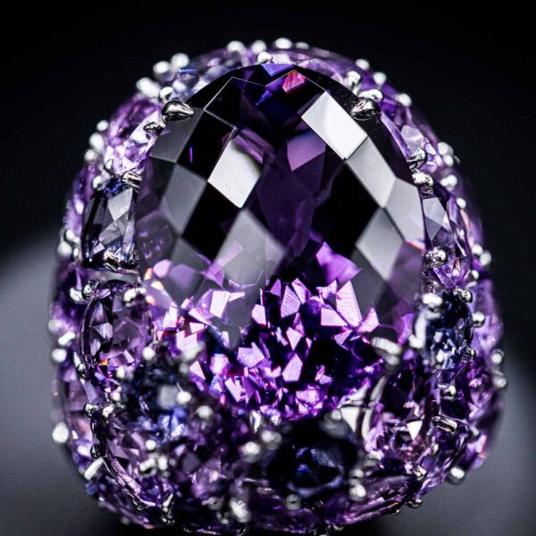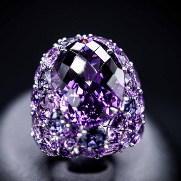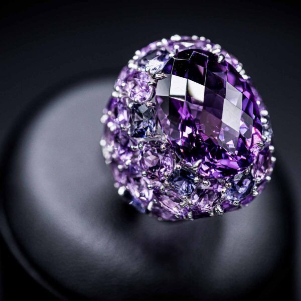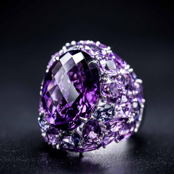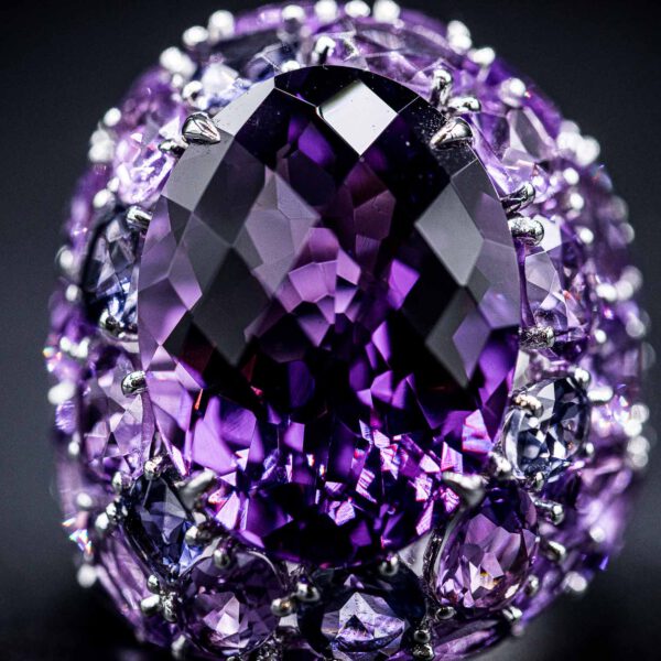 In Weißgold 18 kt mit 6 facettierten Iolithen 2,25 ct und 28 facettierten Amethysten 9,45 ct