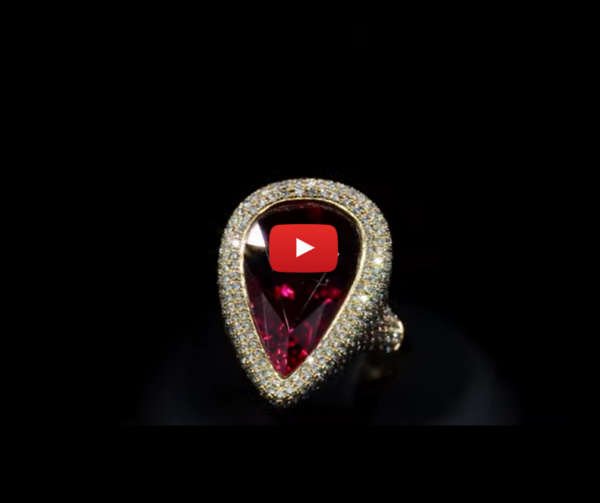 Dieser Ring wurde aus 18kt Gelbgold und einem tropfenförmigen Rubin 15ct gefertigt. Die Pavéfassung ist mit kleinen, Brillanten 2.5ct versehen, die den Rubin funkelnd umspielen.