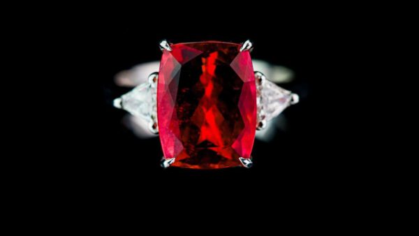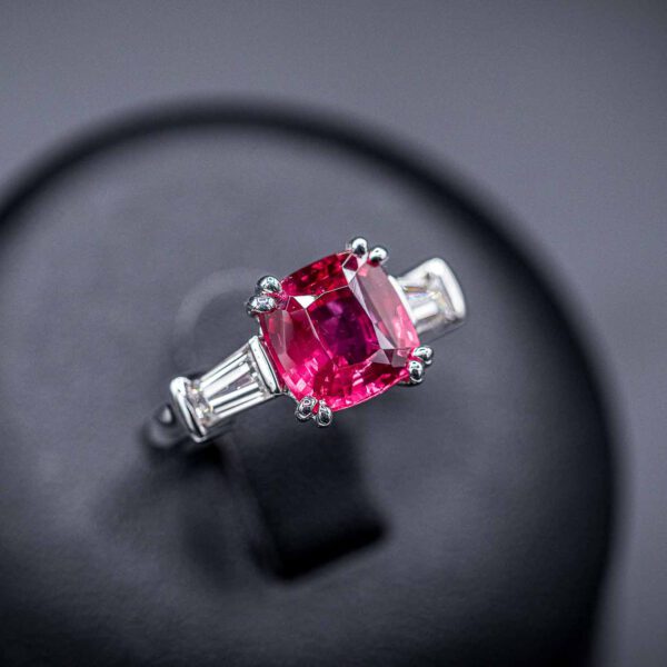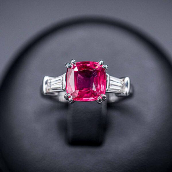 Der in 18kt Platin gefasste pinke Rubellit bildet mit insgesamt 5.74ct das Zentrum des Ringes. Er wurde mit zwei triangelförmigen Brillanten, jeweils 0.33ct, kombiniert – eine elegante und harmonische Kreation.