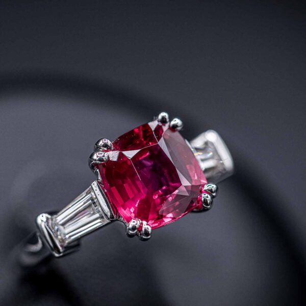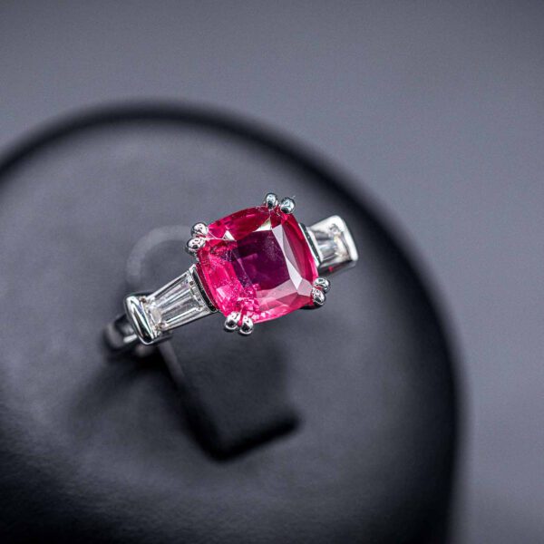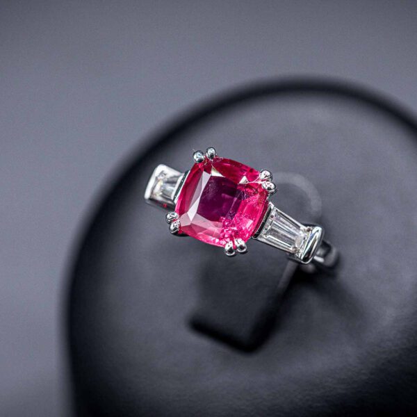 In Weißgold 18 kt mit einem nicht erhitzten Rubin 3,52 ct im Cushion-Schliff und einem Schweizer GRS-Zertifikat. An den Seiten befinden sich 2 Brillanttrapeze.