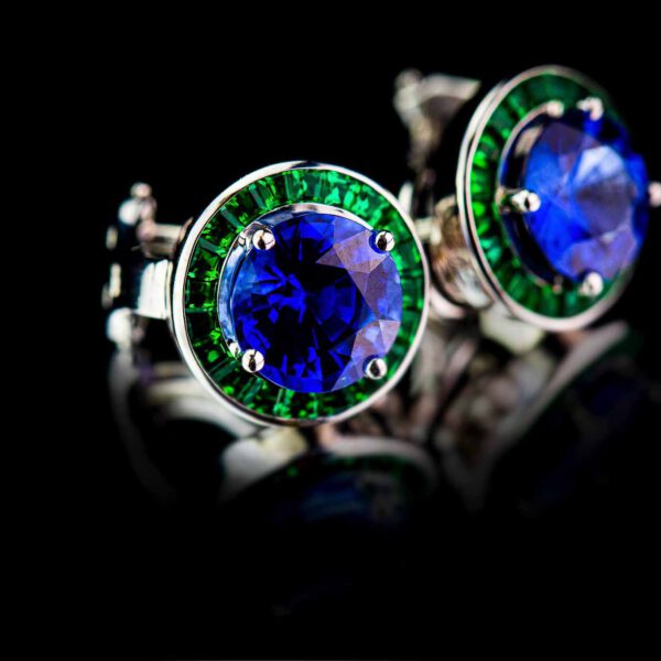 Die zwei Vivid Blue Saphire erstrahlen mit 2.81ct und 2.24ct im Zentrum des Steckers. Auf Kanten geschliffenen Smaragdcarrés fügen sich elegant mit insgesamt 2.35ct ein. Die Edelsteine sind in 18kt Weißgold gefasst.