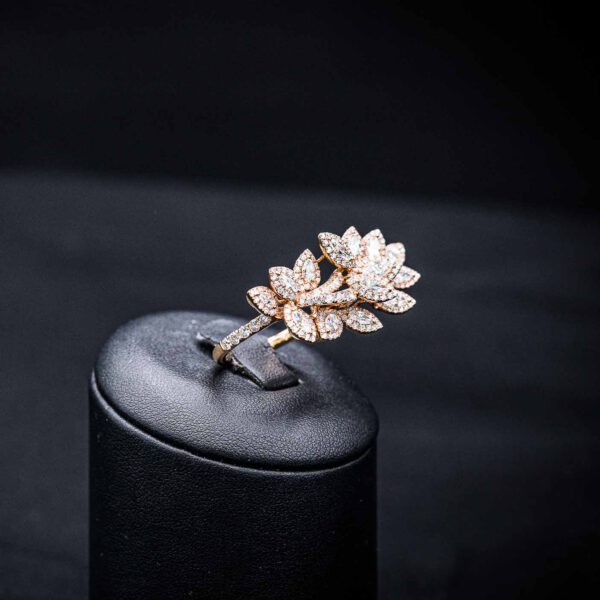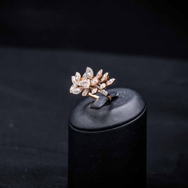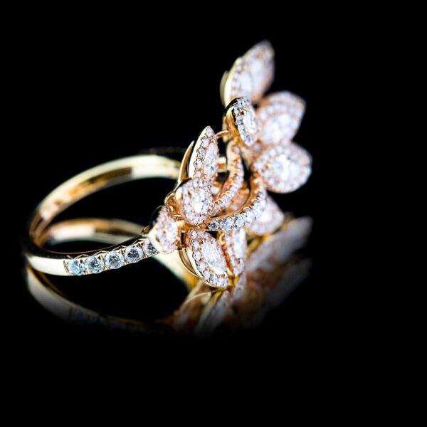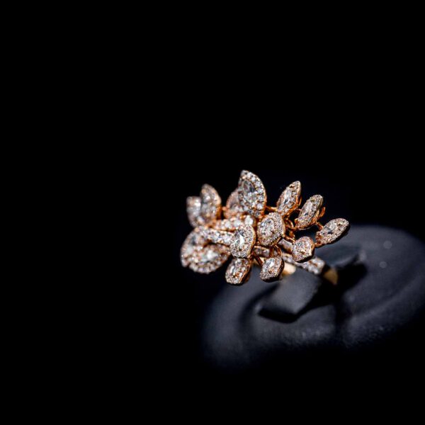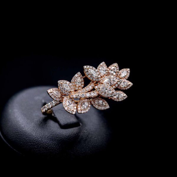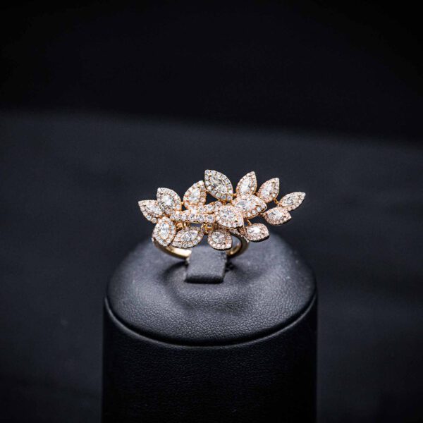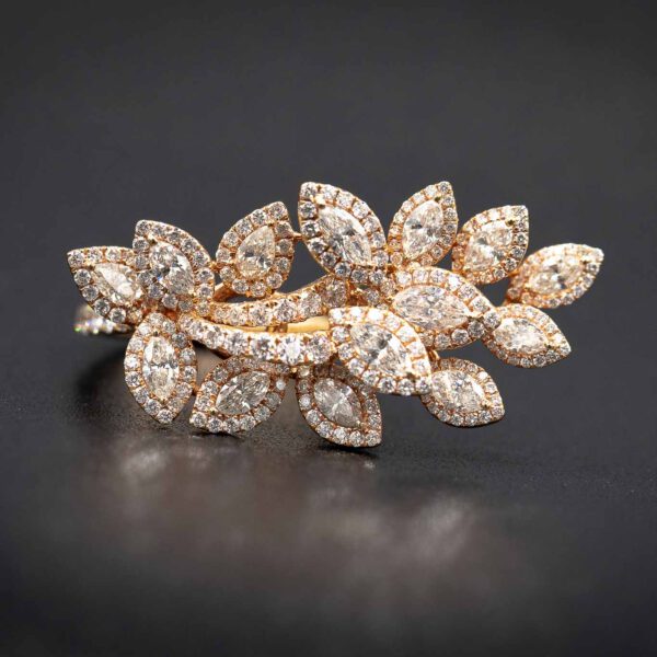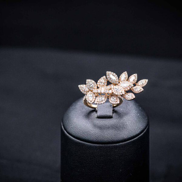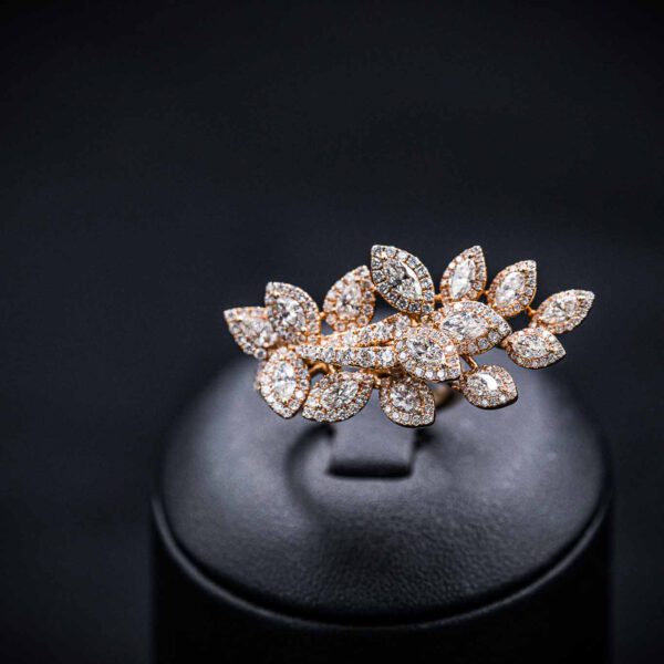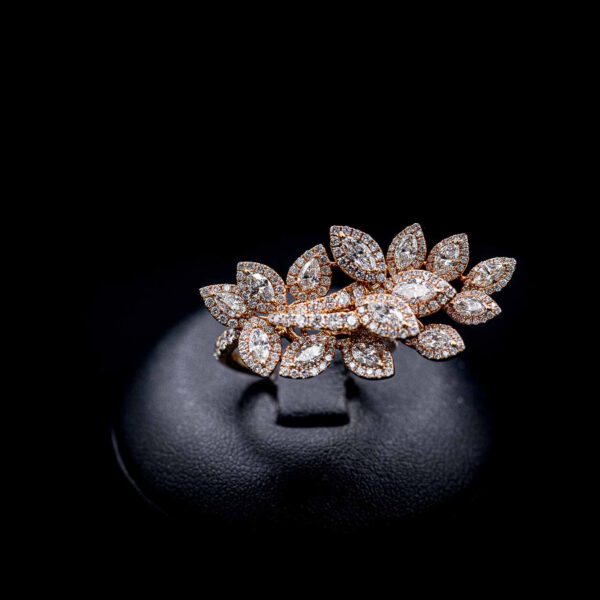 Die in 18kt Roségold gefassten 258 Brillianten mit insgesamt 3.31ct bilden das Zentrum des Ringes. Mit Marquise-förmigen und rund geschliffenen Brillianten erstrahlt er in seiner Blüte.