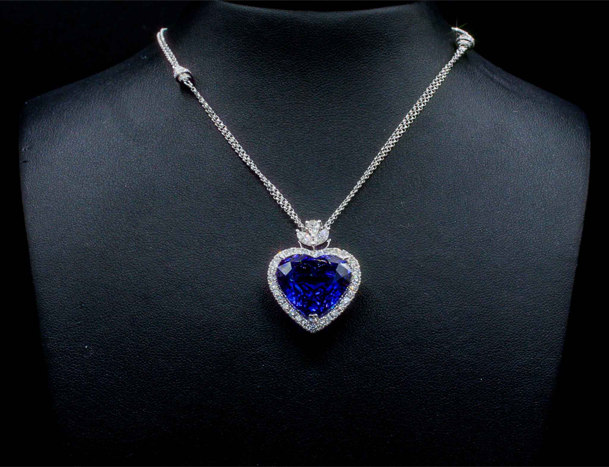 Ein Anhänger in Weißgold 18 kt mit einem Tansaniten in Herzschliff 22,69 ct, 140 runden Brillanten 1,80 ct und 1 Brillanttropfen 0,15 ct